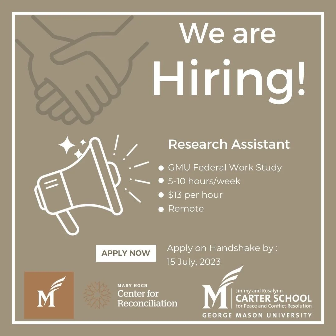 MHCR is seeking a highly organized, independent, emotionally intelligent, and culturally competent / sensitive GMU undergraduate student with Federal Work-Study to support the Transformation and Reconciliation Laboratory (TRL) at MHCR through research and administrative support. Reporting to the MHCR Director, Associate Director, and Laboratory Manager, the Research Assistant (RA) will be responsible for providing support to key research projects at MHCR.