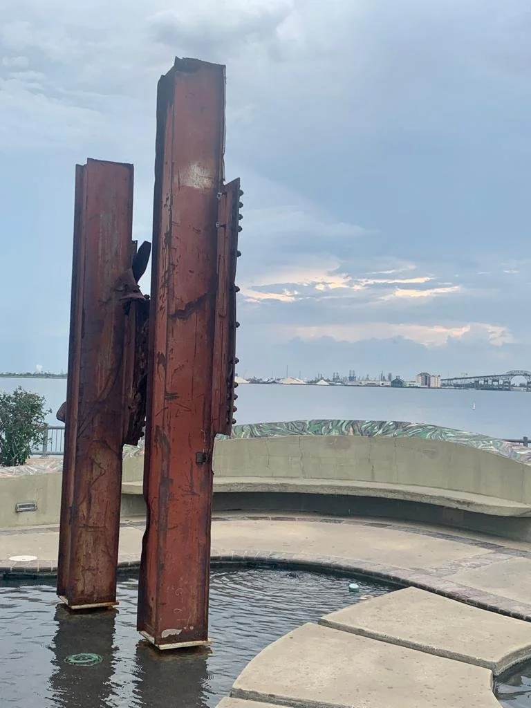 9/11 Memorial in Lake Charles, the I-10 bridge, and several petrochemical plants can be seen across the lake (Photo: Merisa Mattix, Author’s Personal Collection).